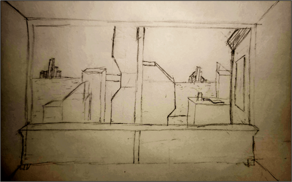 After initial sketches and planning, I sourced free assets from various online services and began building out a rough environment within Unreal Engine. Large portions of the environment were sourced from free KITBASH3D kits and FAB.com asset library built into Unreal Engine.