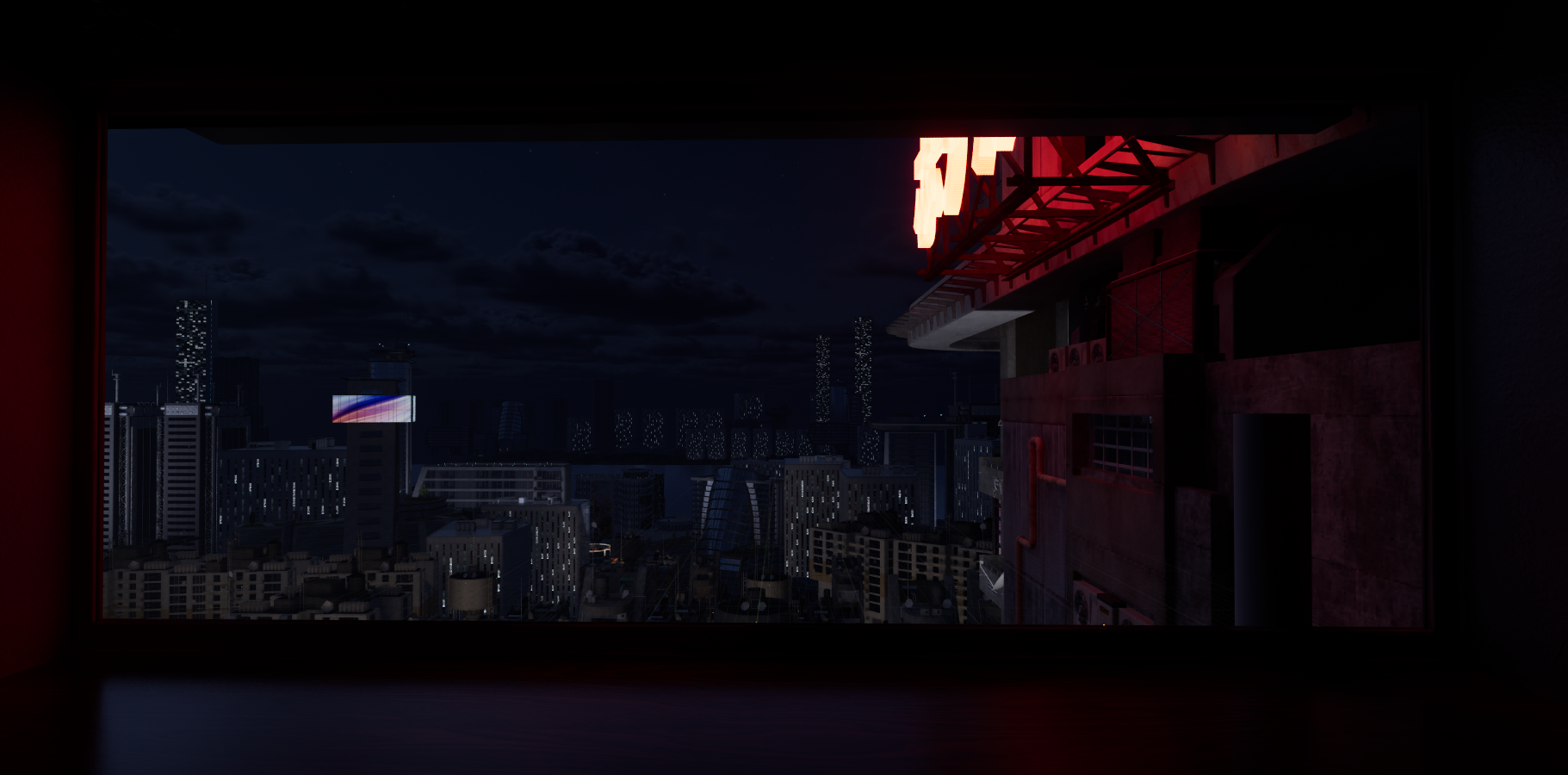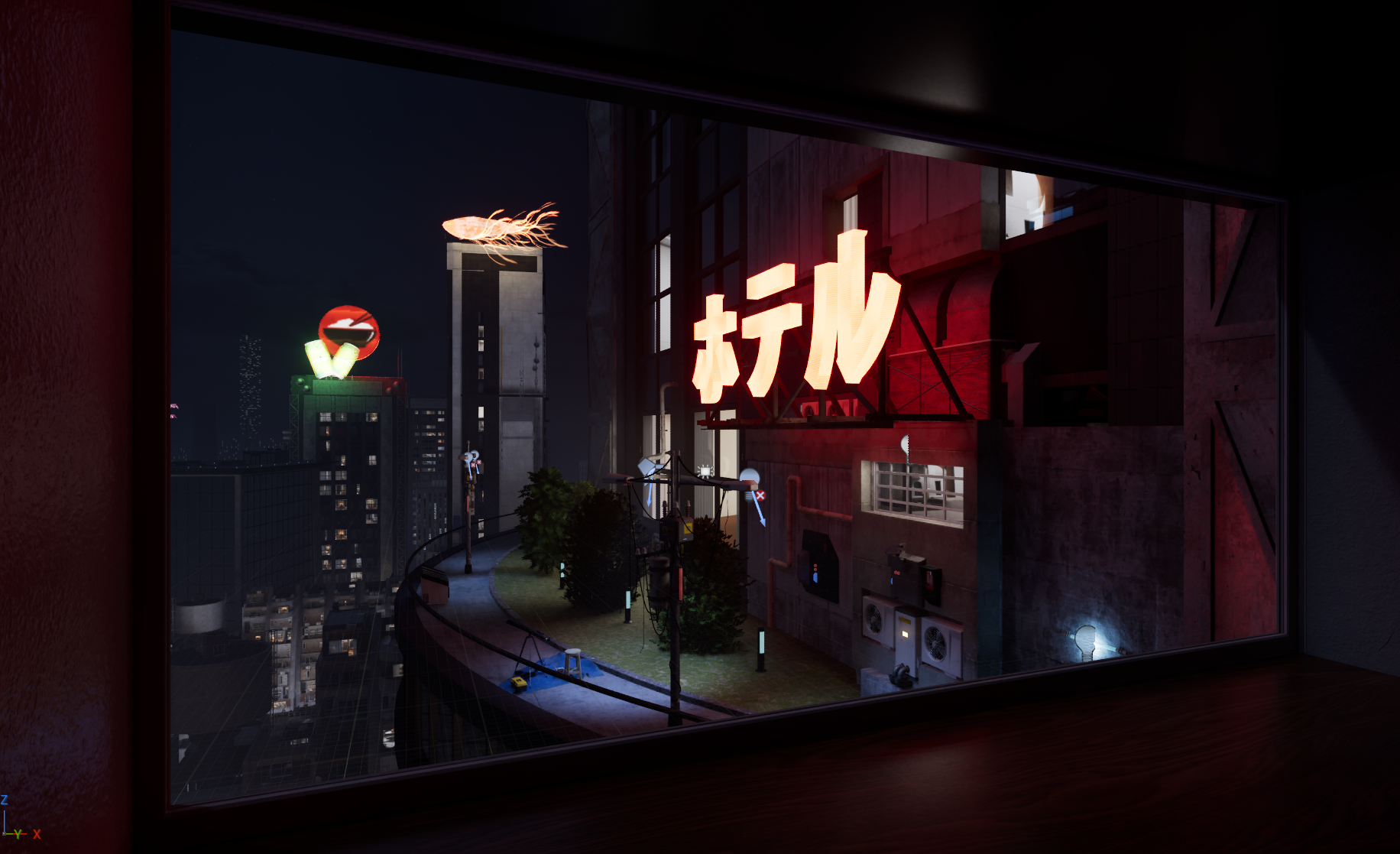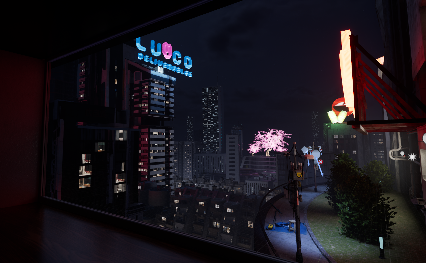 After a couple of iterations, I sourced parallax window assets to allow create the illusion of depth within building apartments. I then further iterated on the design of the layout, experimenting with lighting setups.