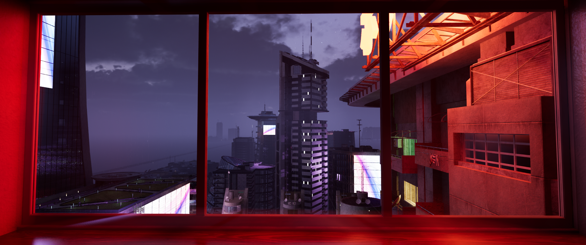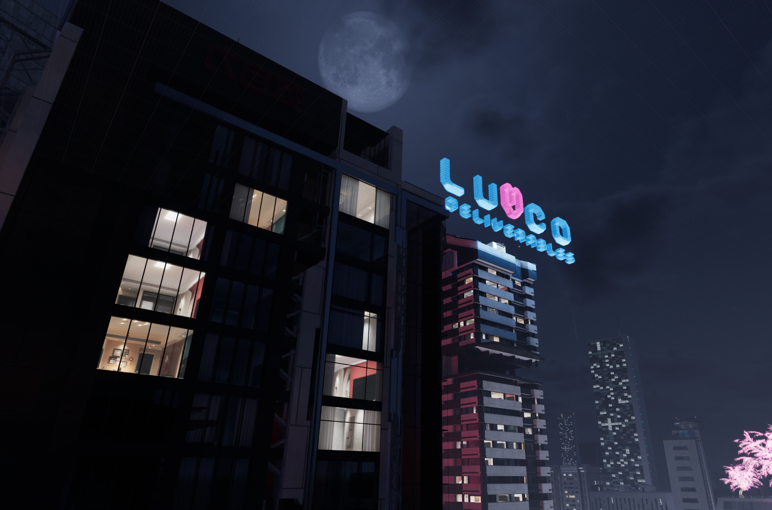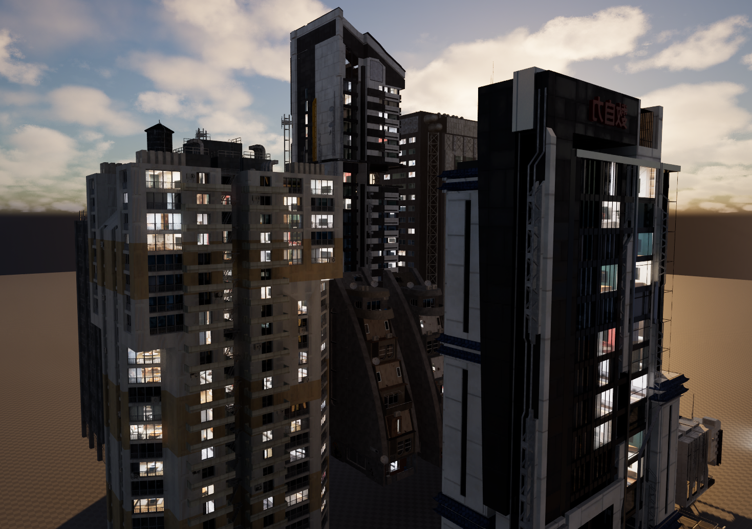 After a couple of iterations, I sourced parallax window assets to allow create the illusion of depth within building apartments. I then further iterated on the design of the layout, experimenting with lighting setups.
