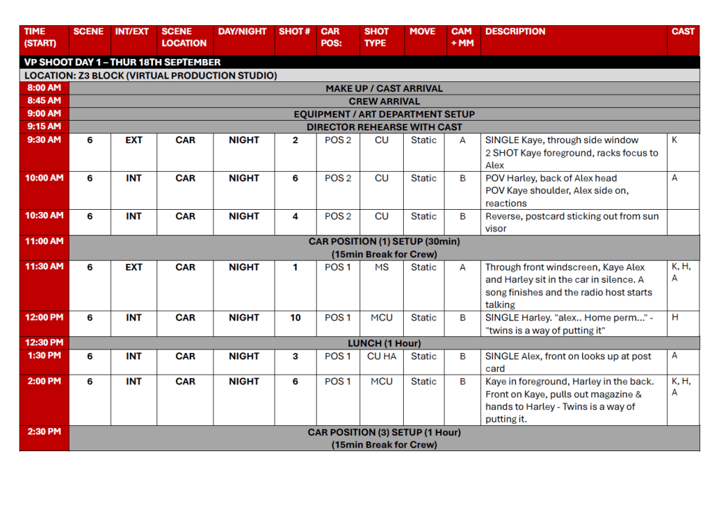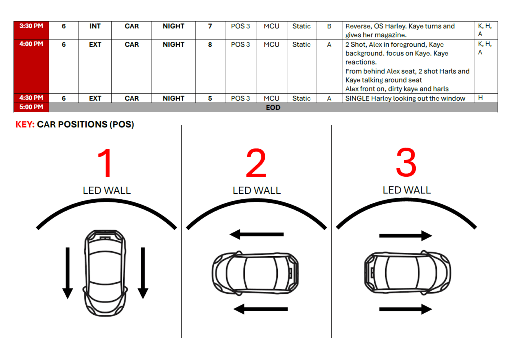 For the production there were a total of five on location shoot days (Two Interior, Three Exterior) with each day a different being a different location. The production also included two large Virtual Production Shooting days, that required the use of a vehicle, which required detailed planning to execute effectively.